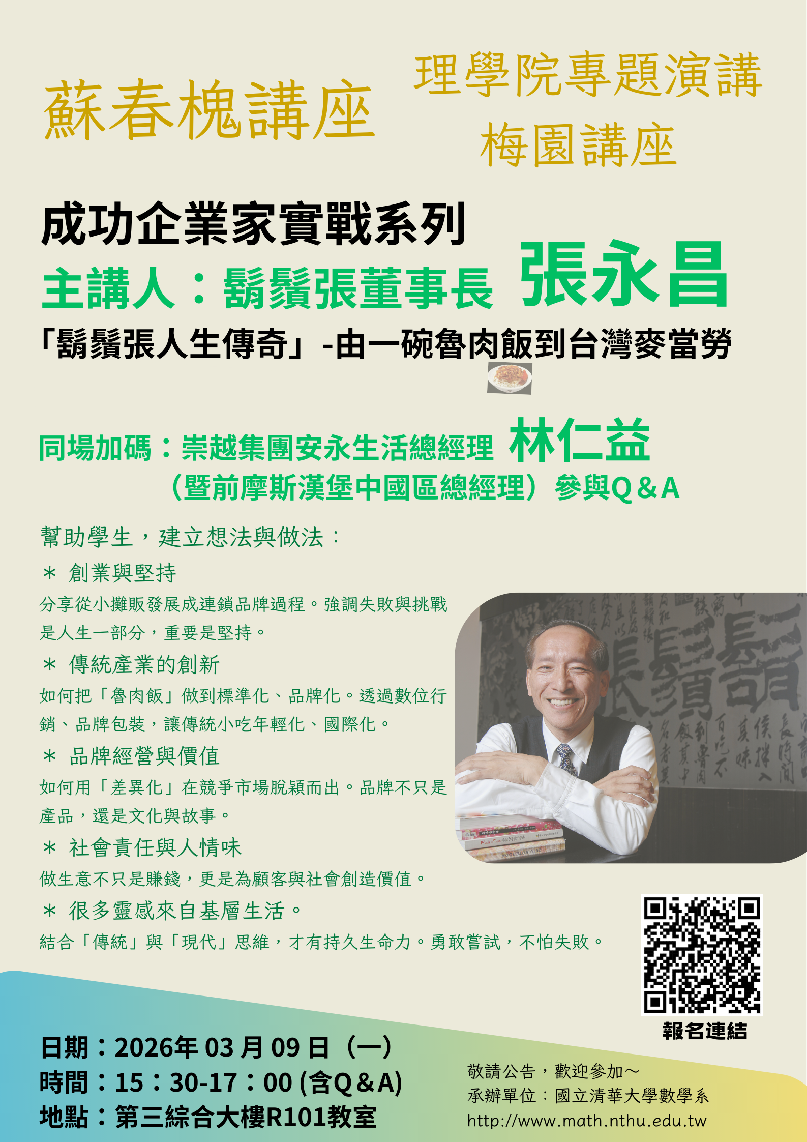 【理學院梅園講座】蘇春槐講座:成功企業家實戰系列|鬍鬚張董事長 張永昌(03/09, 15:30@綜三館R101)